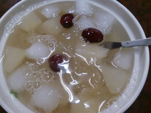 再加入切小丁的梨子和紅棗一起煮到變軟