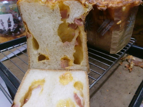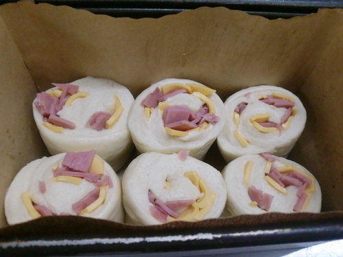 4.鋪上火腿丁及起司丁,灑香料後捲起收口收緊切2半