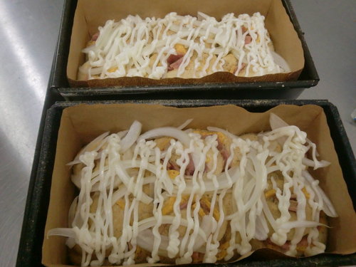 6.後發7分滿時依序放上洋蔥絲擠美乃滋撒香料放披薩絲