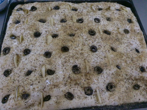 4.用手指戳洞間隔放入蒜片與黑橄欖片