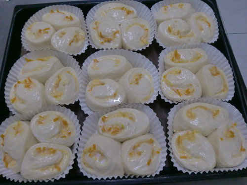 看了kodo的文馬上就想做做看買了幾個香吉士參考carol網誌做了蜜橘皮果醬再煮一份卡士達動工了!烤好時真是滿室生香屋子裡充滿橘皮的香氣女兒吃了說很好吃就是卡士達餡太少了!唉唷喂我的小公主這很難捲的好嗎!配方請參考美食ㄟ半桶師這是一個寶庫唷!