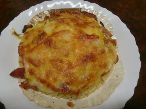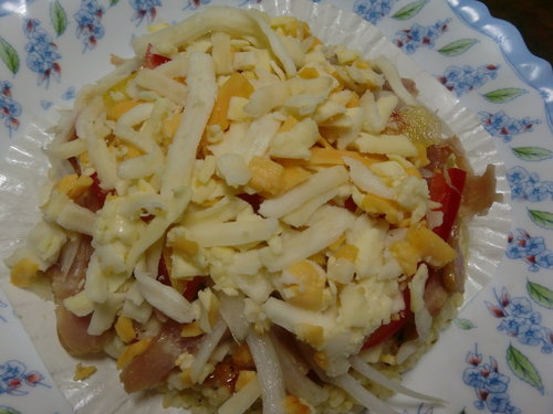 3.餅面抹上番茄醬 先放少許披薩絲 再放燻雞肉 洋蔥絲 甜椒絲