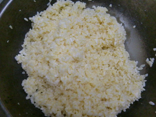 舀入適量的飯攤成圓形煎至一面固定後翻面