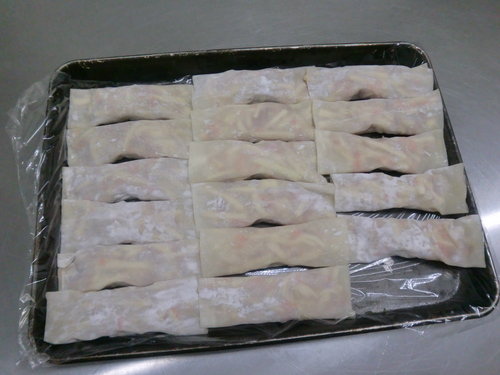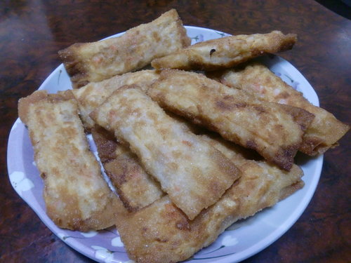 作法:全部材料加調味料拌勻,用餛飩皮包成長條狀,皮的末端沾一點麵糊粘好,入油鍋炸到兩面金黃就好了