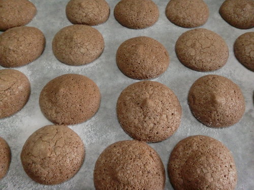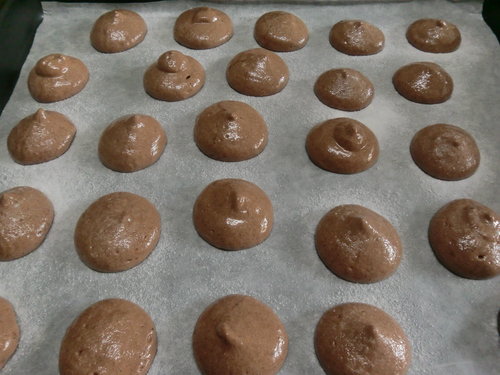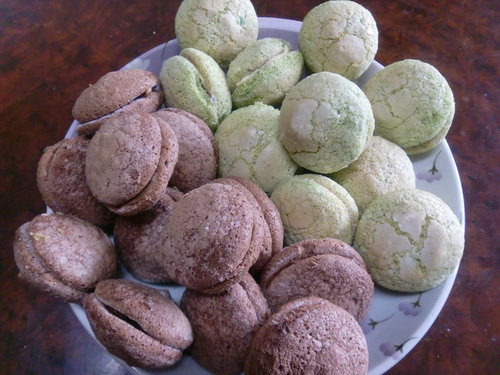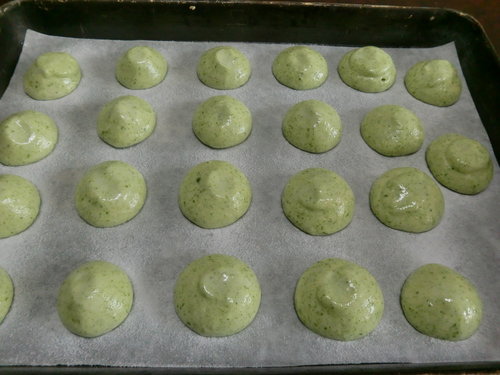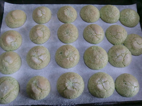 女兒念著想吃這個小點心已經好多年了 一直沒動力做 記得以前我們都稱它為"白泡泡" 趁著年過完了 又還在寒假中 就來滿足她小小的願望吧 只是這次可不能叫白泡泡 應該是綠泡泡和巧克力泡泡囉 材料: 1.蛋黃3個,糖25克,鹽少許 2.蛋白3個,糖50克 3.低筋麵粉75克,無糖可可粉15克,抹茶粉1小匙 作法: 1.蛋黃加糖、鹽打發 2.蛋白加糖打發 3.蛋黃糊和蛋白糊拌合後篩入低粉拌勻 4.將麵糊分成兩份,一份加可可粉,一份加抹茶粉 5.裝入擠花袋,間隔擠出圓形 6.表面篩糖粉後─放入預熱200度的烤箱烘烤約7~8分 7.膨脹且出現不規則裂紋,表面不沾手即熟